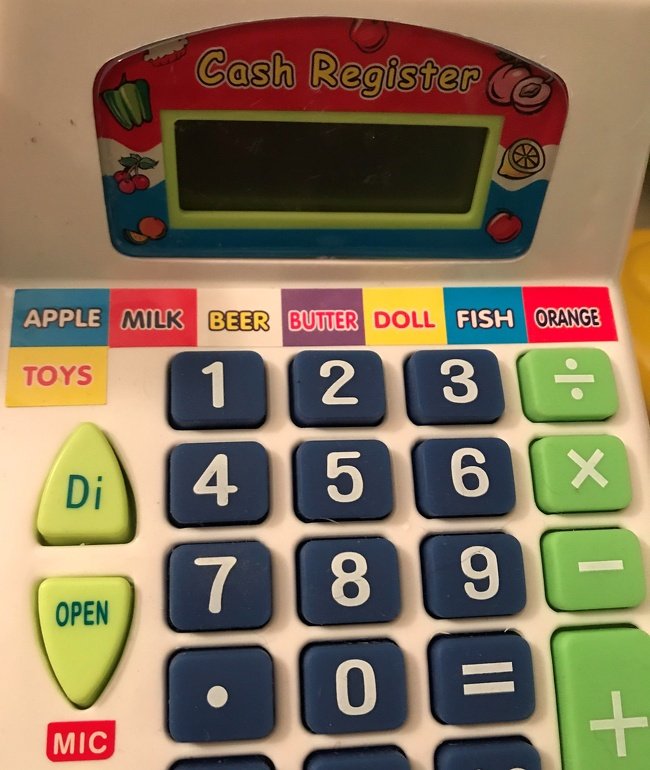 Игрушечная касса для ребенка. Но зачем среди продуктов указывать пиво?