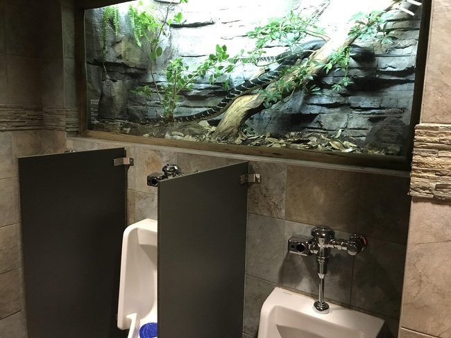 В мужском туалете установлен террариум со змеей. Причина не ясна.