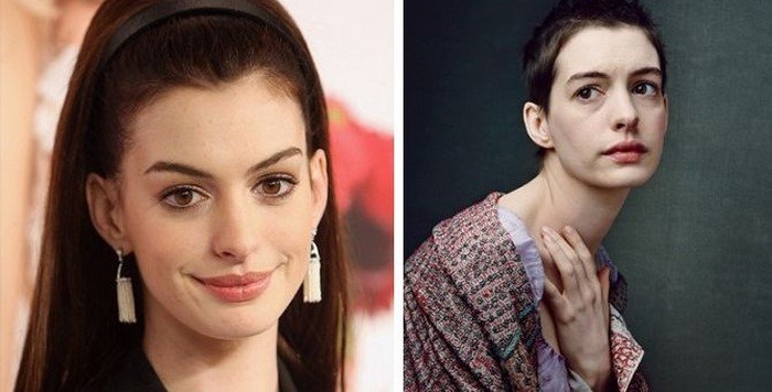 До съемок в фильме «Отверженные» Энн Хэтэуэй носила длинные волосы. Но роль Фантины потребовала от женщины очень короткой стрижки. Энн без колебаний рассталась с пышной гривой, а после съемок и вовсе отказалась возвращаться к прежнему образу.