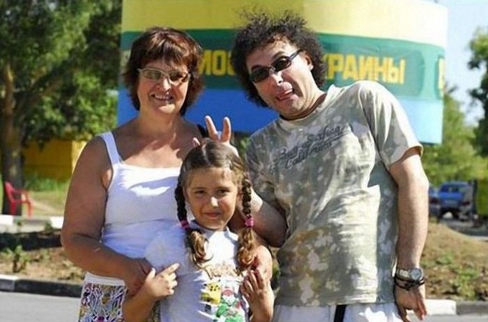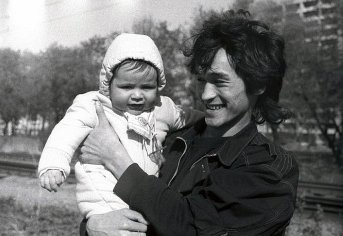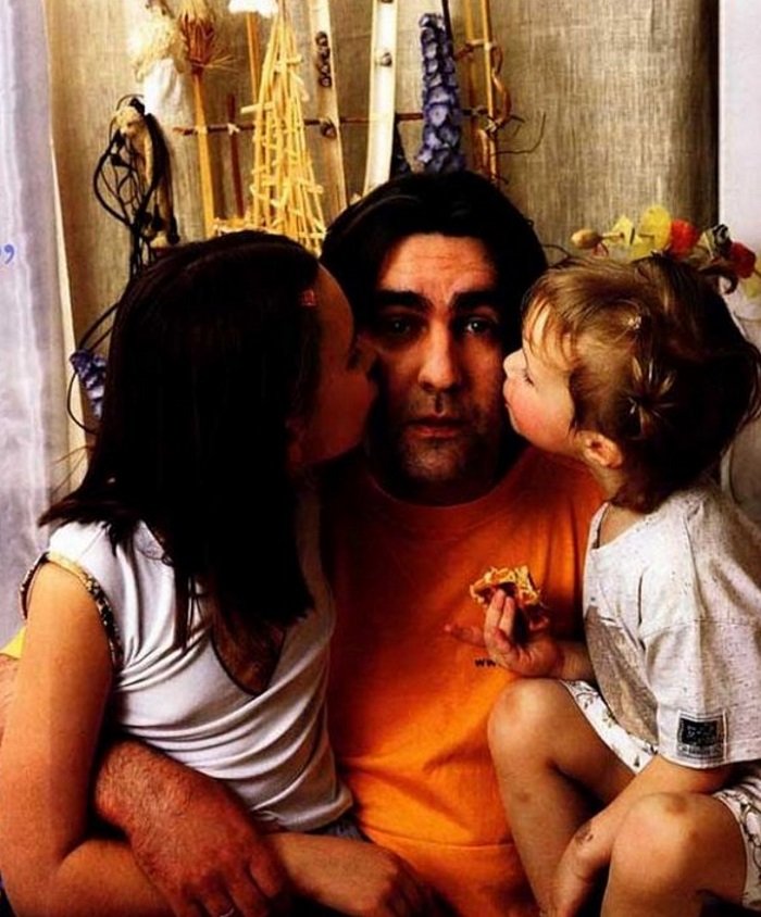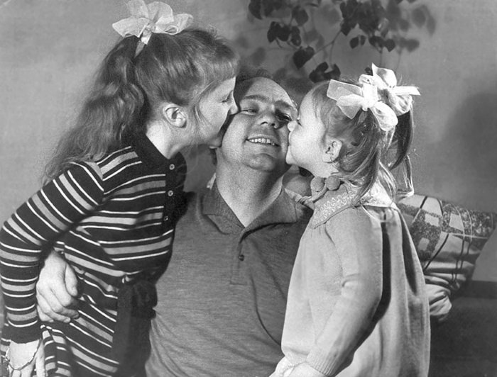 Ариша и Алена целуют своего папу, актера Николая Рыбникова. Снимок из личного архива Аллы Ларионовой.