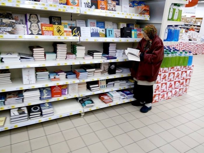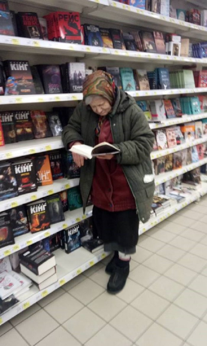 Бабушка в скромных одеяниях робко стоит возле книжного отдела, держа в руках произведение художественной литературы. Вот уже 15-й год подряд вдова сбегает из дому, чтобы хоть ненадолго забыть о тяжелой жизни и насладиться творениями писателей-гениев.