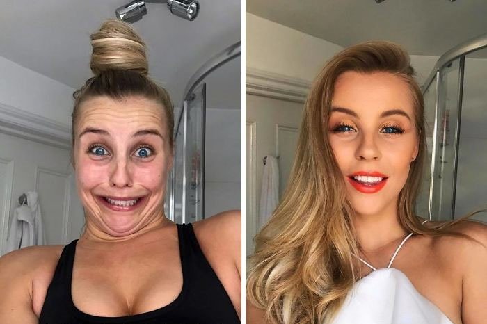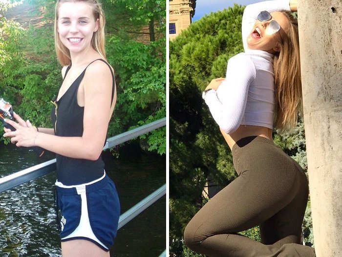 Чтобы проиллюстрировать самые популярные обманы, она делала по два фото. На одном она занимала позу, которую использует модель, чтобы показать свой живот максимально плоским, а бедра стройными.
