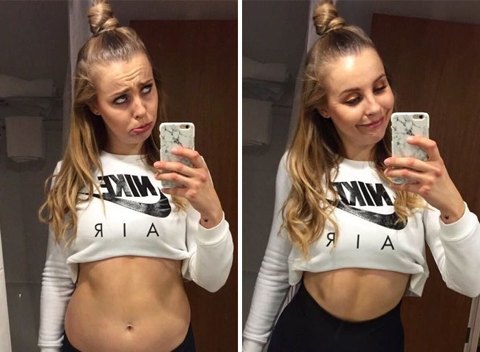 Девушка на собственном примере показывает, как нас обманывают, скрывая свои лишние килограммы и жирок, используя Фотошоп и просто выбирая «правильные» для снимков позы.