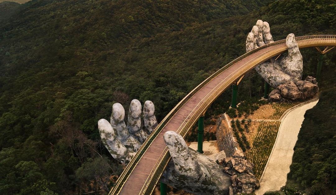 Красивый вьетнамский Золотой мост выглядит так, будто его построили тысячи лет назад
