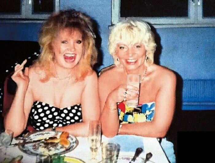 Алла Пугачева лакомится шницелем, рядом с ней сидит подруга Алина Редель, начало 90-х