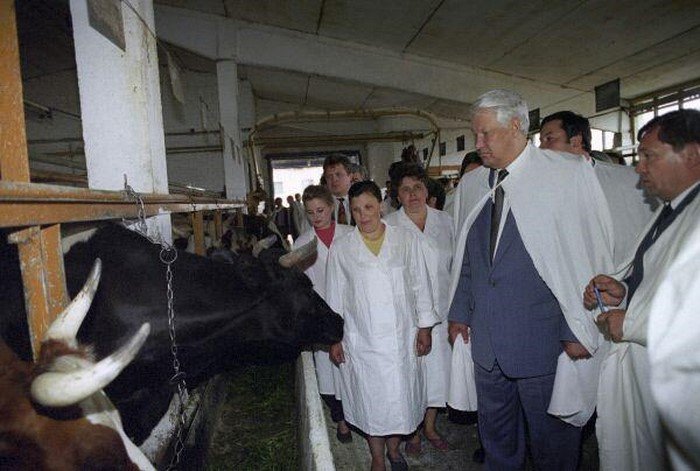Борис Ельцин осматривает скот. Москва, 1993 год