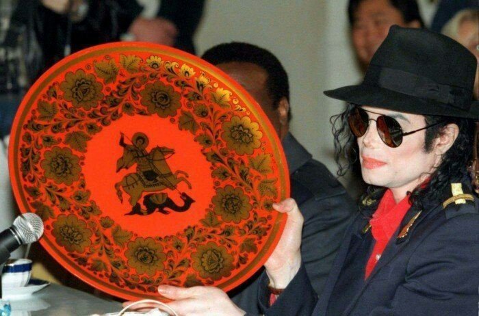 Майкл Джексон держит тарелку, полученную в подарок от Юрия Лужкова, 1996 год