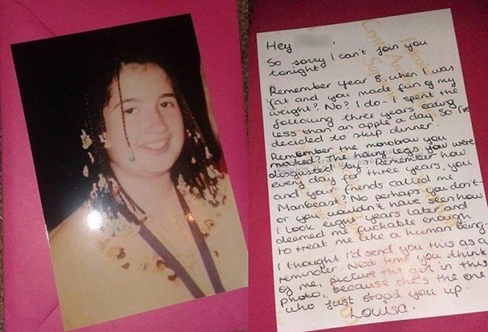 «Помнишь, как ты презирал меня за сросшуюся бровь и волосатые ноги? Наверное, ты и подумать не мог, что через 8 лет будешь звать меня на свидание. Для тебя я оставила фото восьмилетней давности. Вспоминая обо мне, знай, что именно девочка на фото дала тебе отпор».