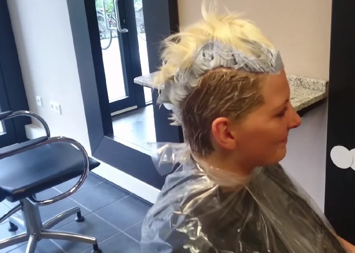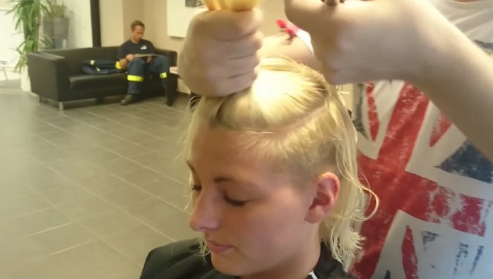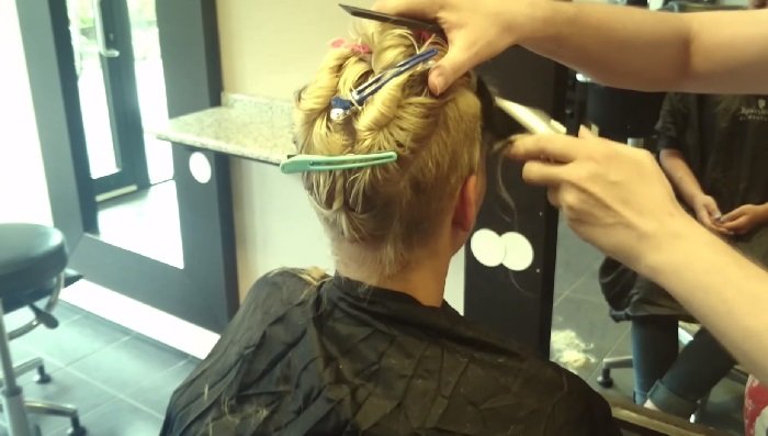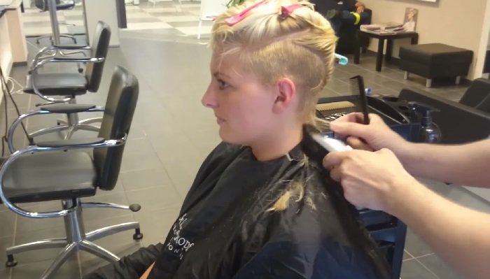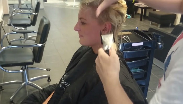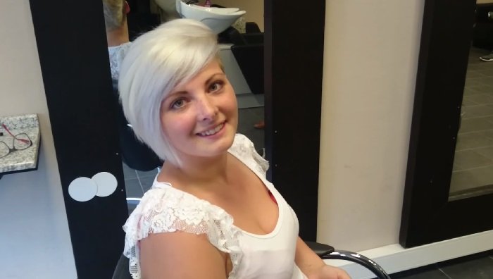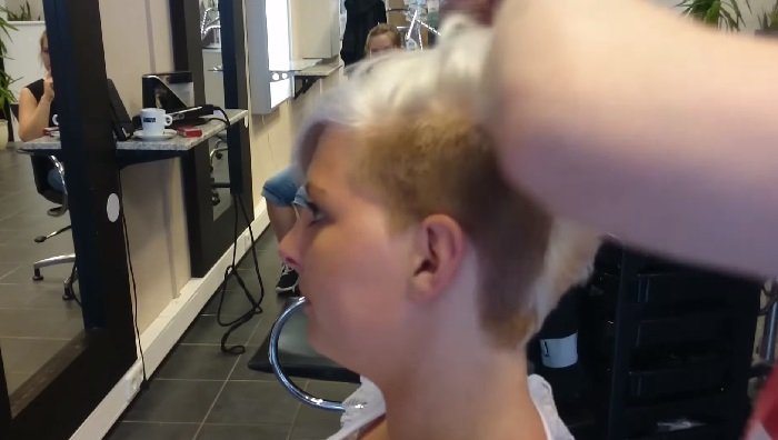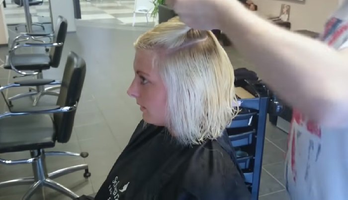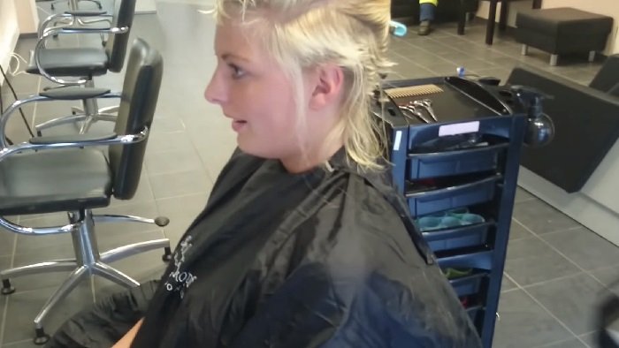 На видео девушка, которая решила сделать себе короткую стрижку. У нее были волосы средней длины, но даже такая длина показалась ей большой, когда парикмахер состриг первую прядь.