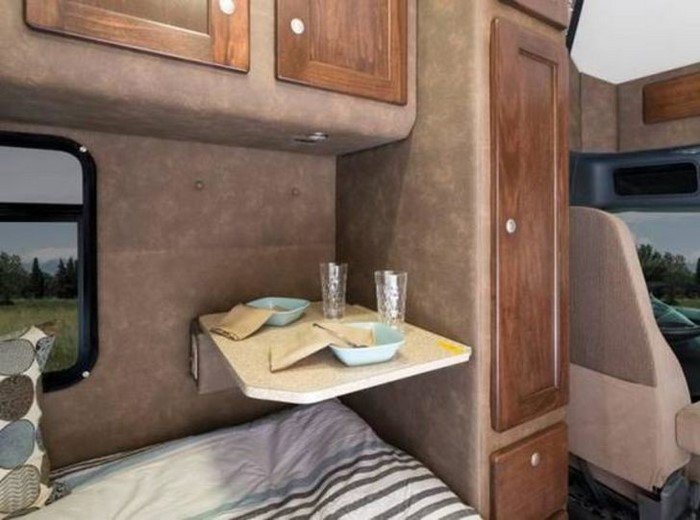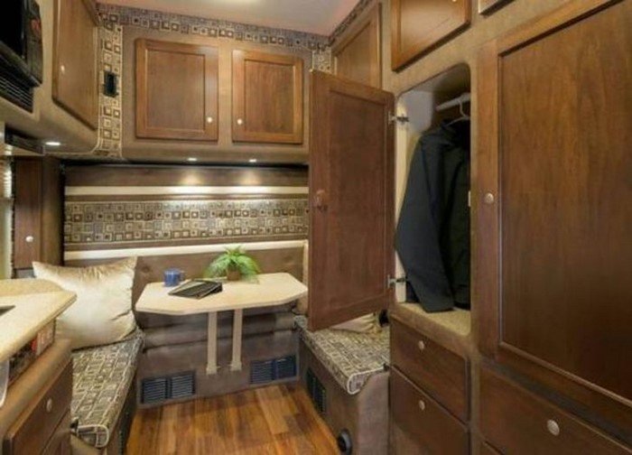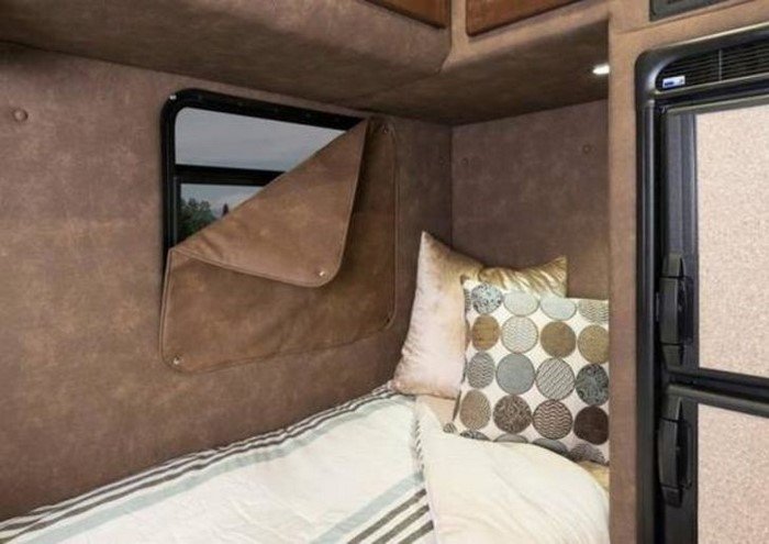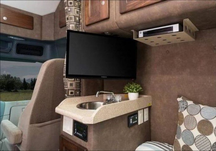 На типичный, «спартанский» жилой модуль дальнобойщика такое помещение совершенно не похоже. Здесь мы скорее видим несколько подсокращенный вариант дома на колесах. Разумеется, даже молодой семье в таком будет тесно. Но для одинокого водителя — в самый раз!