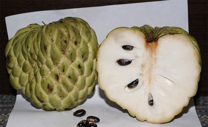 Атемойя, появившаяся в результате скрещивания кремового и сладкого яблока, довольно калорийна. И всё же, если стоит выбор между этим фруктом и эклером, атемойя отлично заменит десерт, к тому же она в разы полезнее.