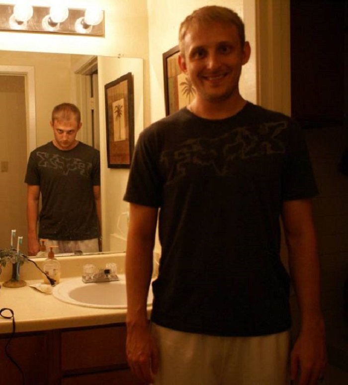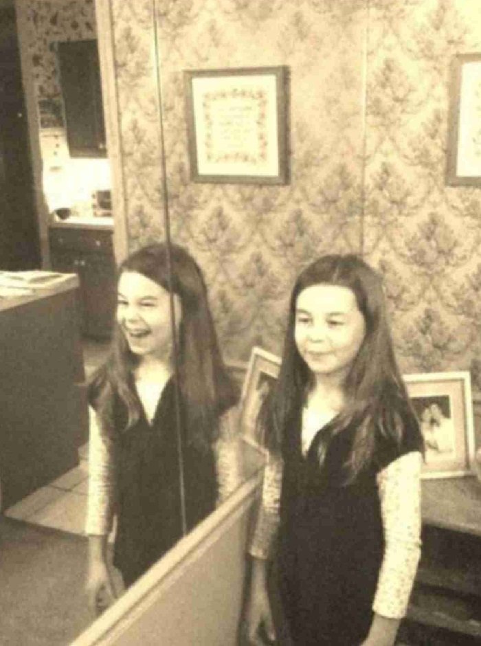 Отражение девочки в зеркале перепугает даже бесстрашного мужчину. Скорее всего на фото близнец девочки, который умер при родах, однако дух нерожденного ребенка пристал к сестре.