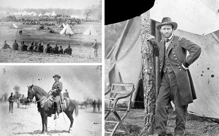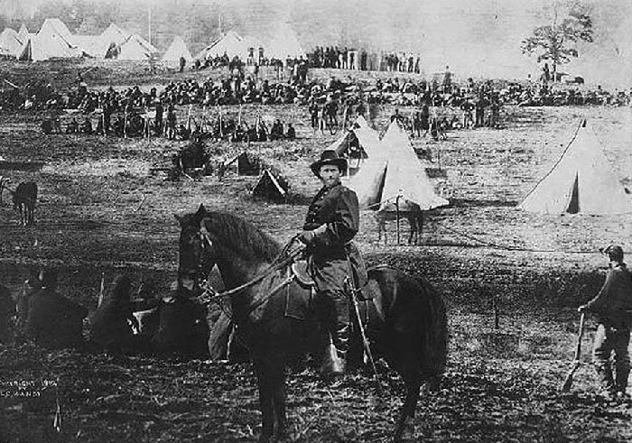На снимке легендарный американский генерал Улисс С. Грант сидит верхом на лошади на фоне лагеря своей армии. Военачальник северян времен Гражданской войны в США выглядит бесстрашно и самоуверенно.
