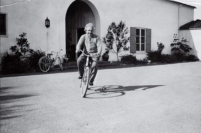 Кажется, что Альберт Эйнштейн беззаботно покидает на своем велосипеде полигон, на котором проводились испытания атомной бомбы. Его улыбка сообщает нам об успехе американского оружия.