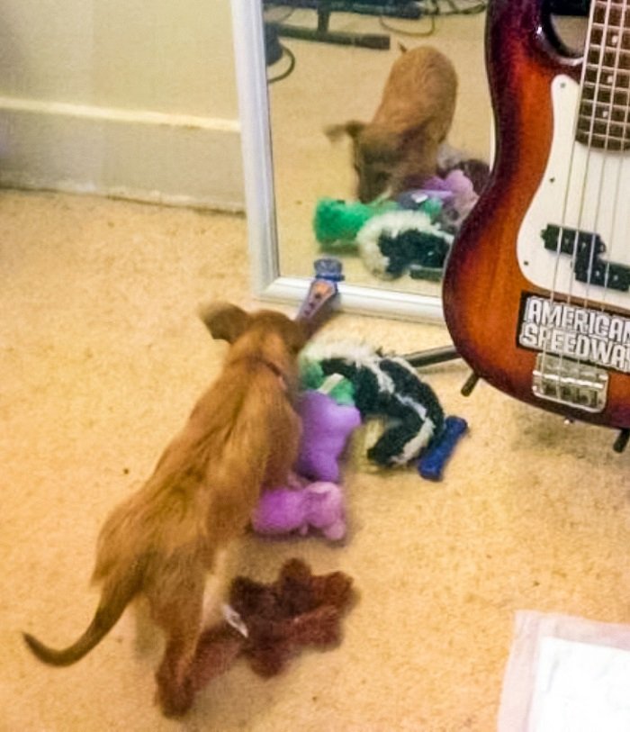 Это доброе животное решило поделиться игрушками со своим собственным отражением…