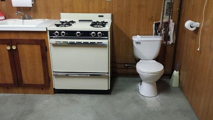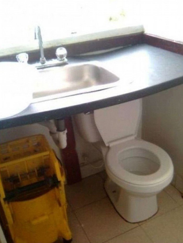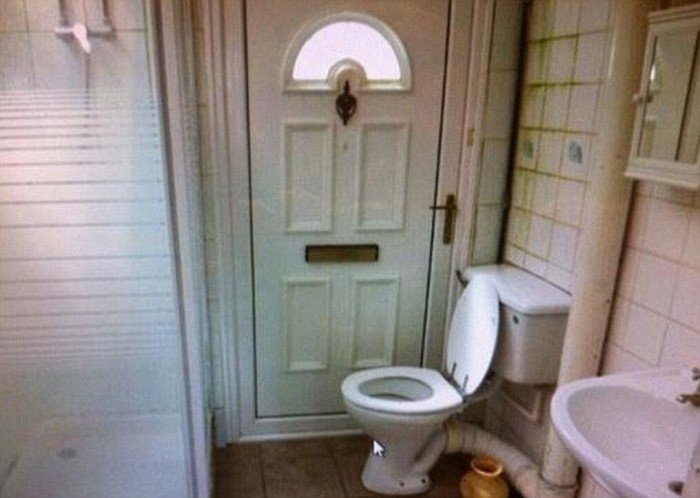 Даже боюсь представить, что было на уме у дизайнеров этих нелепостей. Тут тебе и унитазы под столешницей, и напротив двери в лифт, и у входной двери нашли место… Как никак, зов природы может настичь где угодно, наверное поэтому люди устанавливают нужники даже на лестничных площадках.