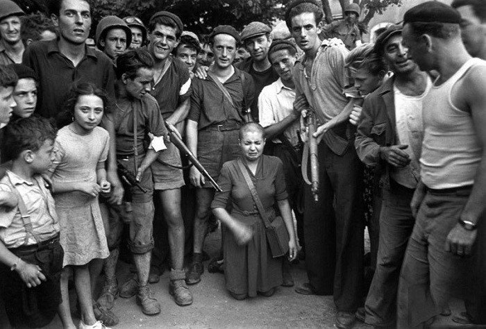 И виноватыми стали женщины и девушки, которые встречались с немцами. Их остригали и прогоняли по улицам, всячески оскорбляя, закидывая камнями и грязью. Странно, что людей, которые приветствовали нацистов и которых можно было даже опознать по многочисленным фото, никто преследовать не стал.