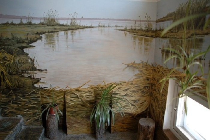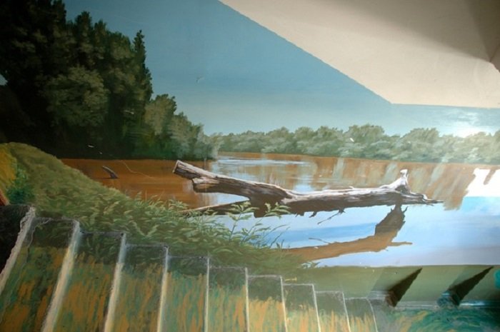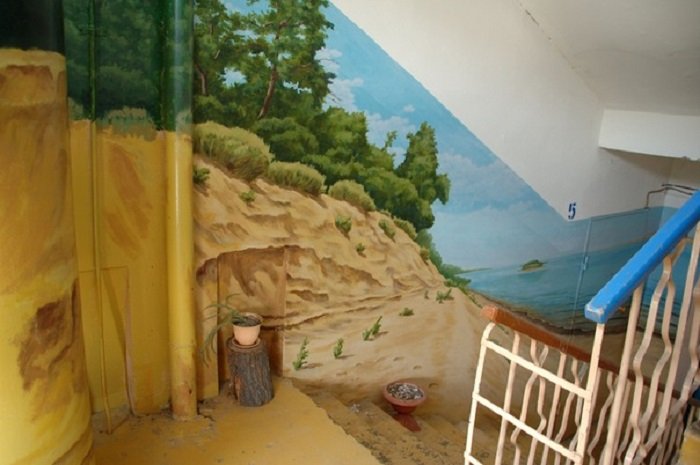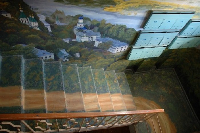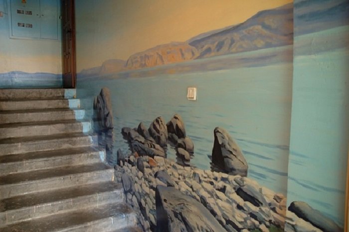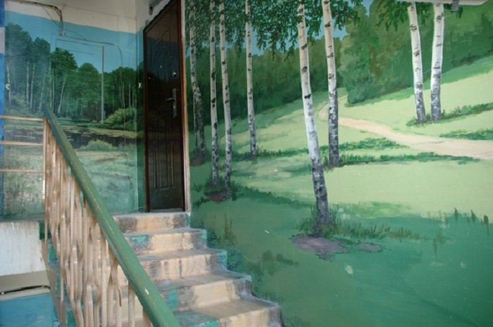 Ничем не примечательные стены подъезда по улице Московской теперь радуют его жителей чарующими пейзажами. На первом этаже раскинулась березовая роща, на втором красуется прекрасная речная гладь.
