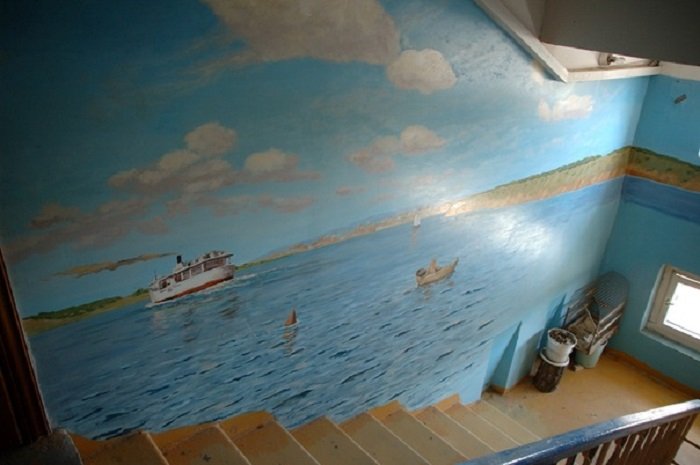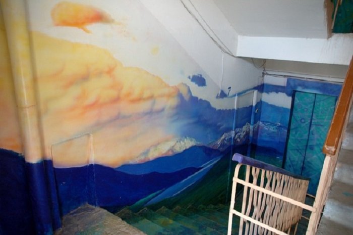 Художник из Астрахани Борис Черниченко решил украсить картинами стены собственного подъезда. Трудно представить, но разрисовывал он по ночам.