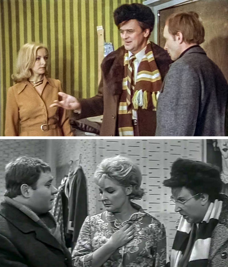 Именно таким приемом воспользовался режиссер во время съемок картины «Ирония судьбы, или С легким паром!». Сцена, в которой есть блондинка, ревнивец и третий лишний была в его же картине «Зигзаг удачи». В общем, не зря на Ипполите именно такой шарфик…