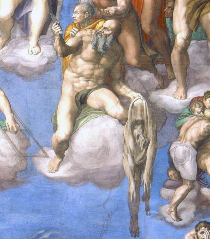 В свое время великий художник расписал стену Сикстинской капеллы в Ватикане. Создание фрески отнимало у живописца много сил, поэтому некоторые исследователи предполагают, что изображенная на картине кожа человека в руках святого Варфоломея — это автопортрет Микеланджело.