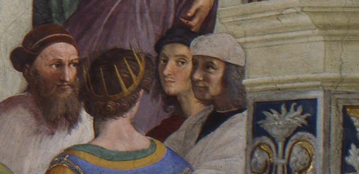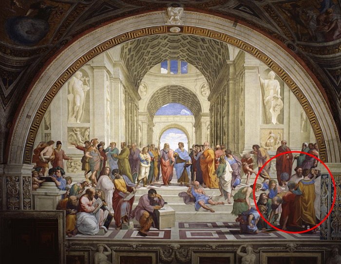 На данной фреске Рафаэль нарисовал лица многих известных личностей. Есть тут и Сократ, и Пифагор, и даже Леонардо да Винчи. Художник не упустил возможности «спрятать» на полотне и автопортрет. Рафаэля можно заметить в правой части картины, смотрящим прямо на зрителя.