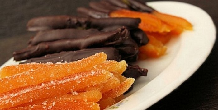 Эти сладости делают из фруктов, овощей или ягод, вываривая их в сиропе и высушивая. Таким образом настоящие цукаты никогда не будут слишком яркими. Для проверки качества достаточно опустить их в теплую воду. Из подделок сойдет краска или они вовсе растворятся.