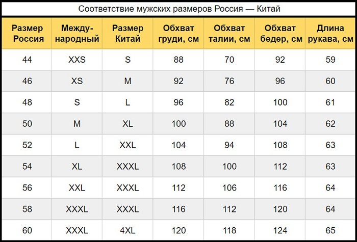 С мужскими размерами проще: американские отличаются от российских на 10 единиц в меньшую сторону. Например 46-й российский размер — это 36-й американский.