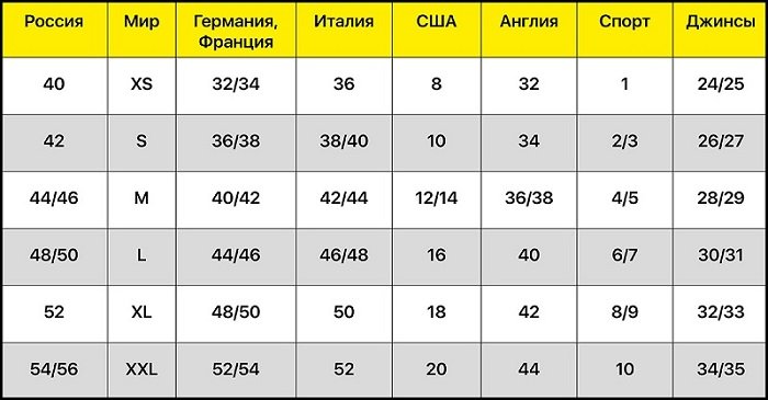 Иногда продавцы предоставляют информацию о том, какой размер подходит под какие мерки. А порой можно просто отправить измерения своего тела, и в магазине сами подберут одежду, которая подойдет конкретно тебе.