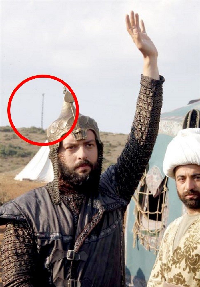 Конечно же, как в историческом сериале не обойтись без современных вышек, автомобилей, женщин в пальто, мобильников и выключателей ламп?