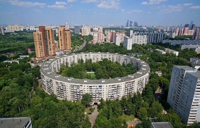 Учитывая не самый простой процесс строительства, второе здание появилось лишь спустя 7 лет в 1979 году на улице Довженко. По сути своей, это были всё те же советские панельки, просто закругленные, диаметром в 155 метров. В каждом доме чуть меньше 1000 квартир и более 20 подъездов, жили и живут там рядовые москвичи. Из знаменитостей можно вспомнить разве что Эмиля Лотяну, Галину Беляеву и Савелия Крамарова.