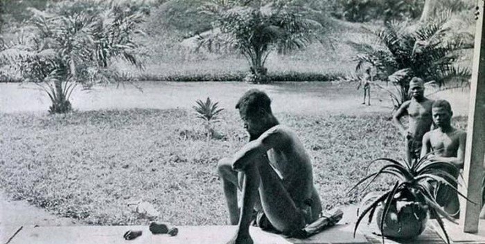 Казалось бы, обычное фото, пока не понимаешь, что перед мужчиной лежат человеческие кисть и стопа. В Конго мужчина не справился с дневной нормой работы, потому надсмотрщики съели его дочь, а части отправили в назидание.