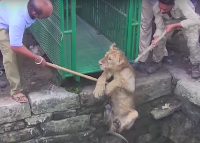 Мужчину в специальной металлической клетке медленно опустили вниз. Там Рахим умудрился накинуть львице на плечо лассо, затянув его так, чтобы животное можно было беспрепятственно вытащить на поверхность. Несколько активистов поднатужились, и вскоре уставшая хищница уже очутилась в клетке.