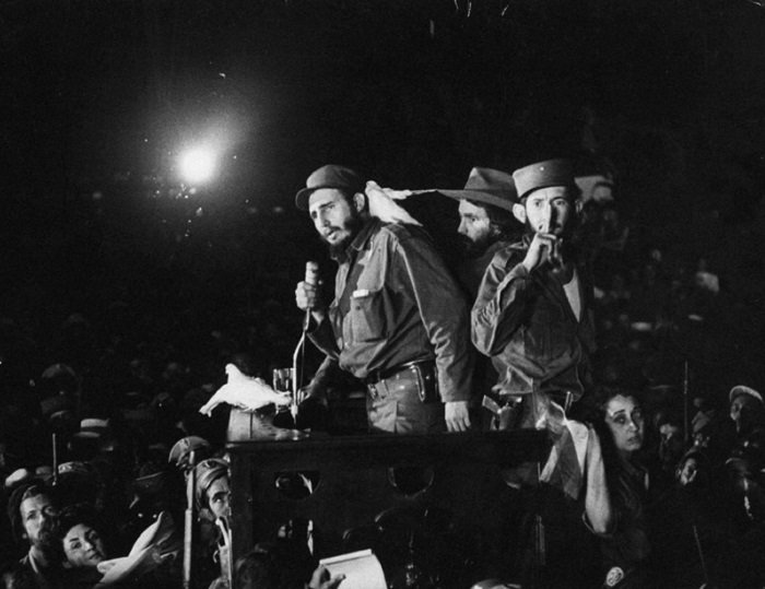 Голубь сидит на плече Фиделя Кастро во время его речи, 1959 год