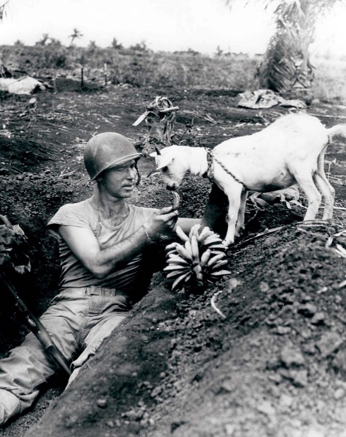 Солдат делится бананом с козленком при битве за Сайпан, 1944 год
