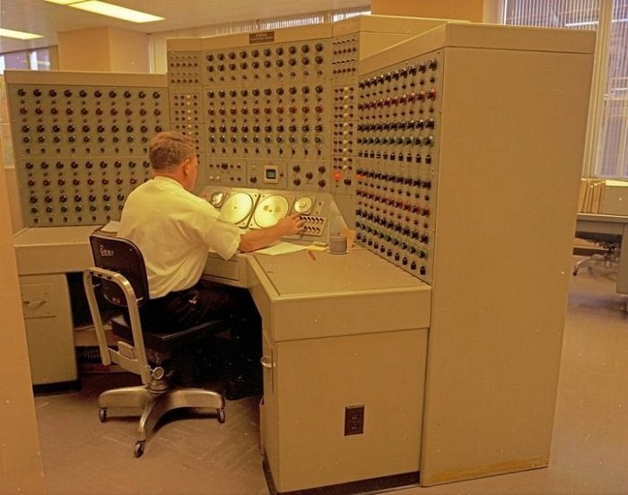 Мужчина работает над созданием новой модели компьютера, 1968 год