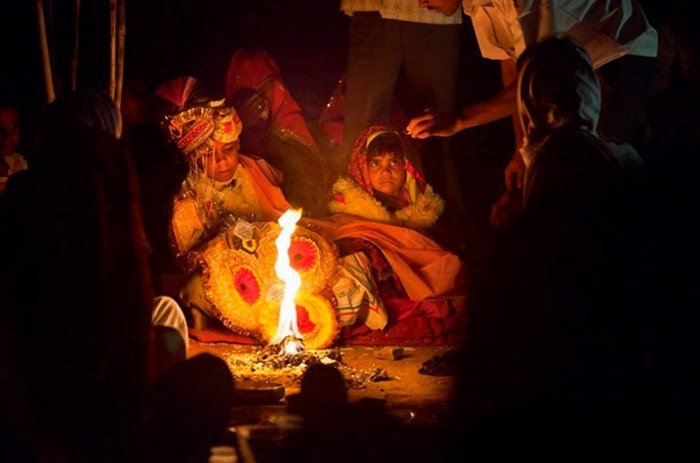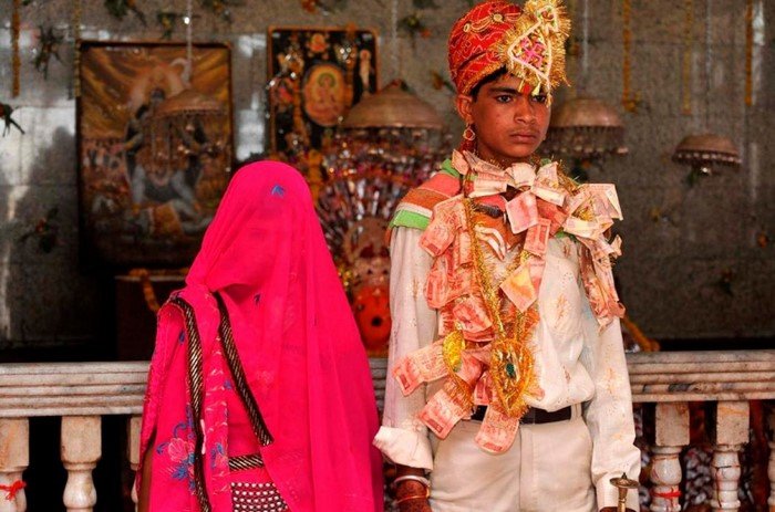И снова Индия. На брачной церемонии со снимка ниже жениху было всего 14 лет, а невесте — лишь пять! В таких союзах малолетние невесты зачастую выступают в роли валюты, которой их семья без колебаний расплачивается за помощь со стороны родственников жениха.