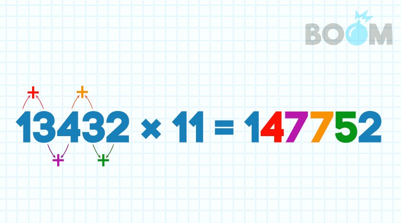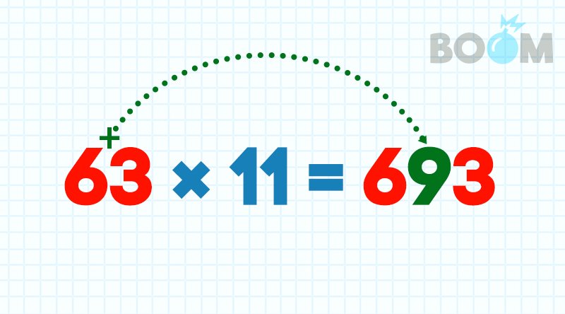 На 11 можно запросто умножить что угодно, если знать этот простой прием. Даже если сумма цифр получилась двузначной, не беда. Вторую цифру пишем посередке, первую добавляем к первой цифре изначального числа — и вуаля!