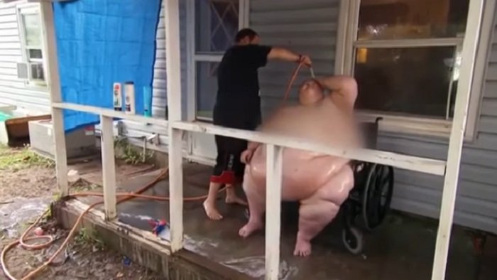 Парень Чарли моет ее на крыльце, потому что Николь уже не помещается в ванную.
