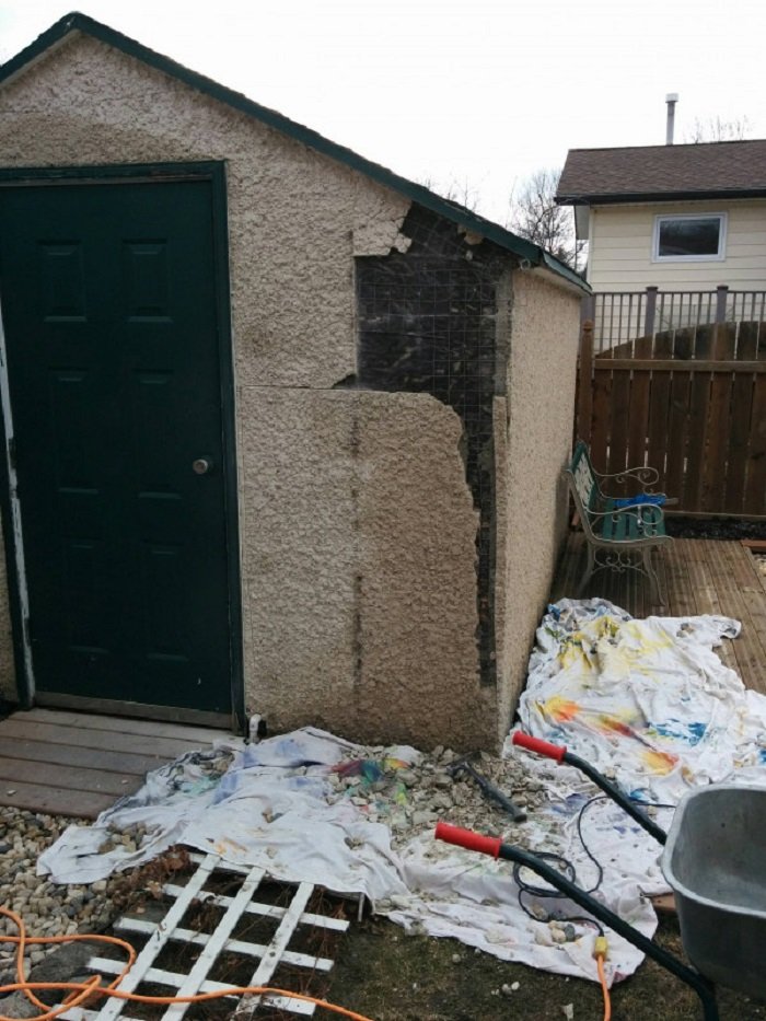 Первым делом мужчина принялся снимать штукатурку, используя болгарку с диском для резьбы по камню. Этот процесс занял намного больше времени, чем он предполагал. После снятия раствора мастер на все руки закупил дешевых обоев — всё равно их закроет обшивка из досок.