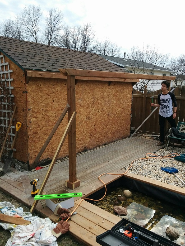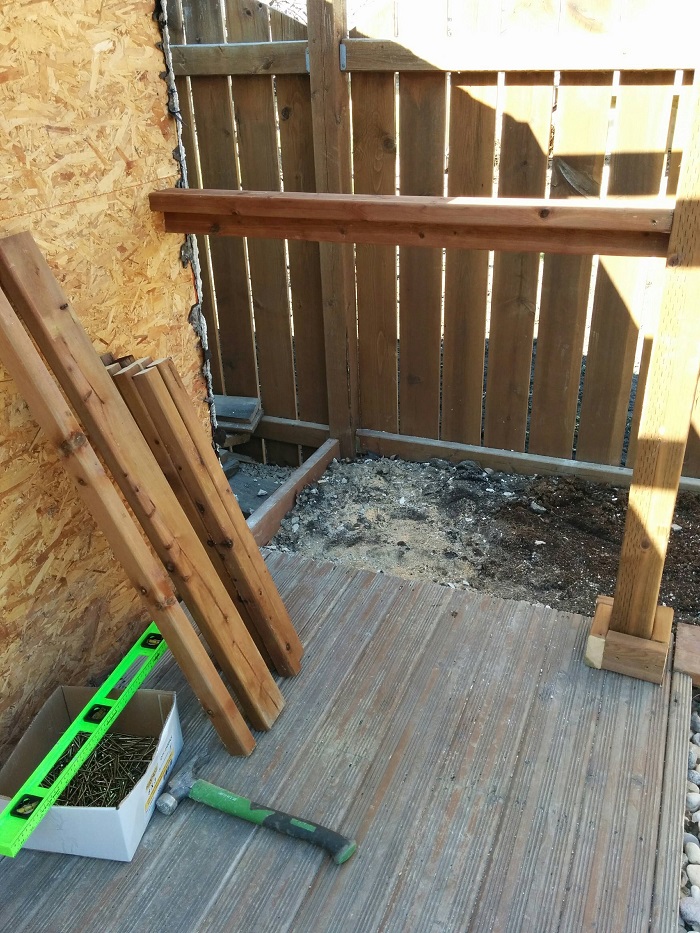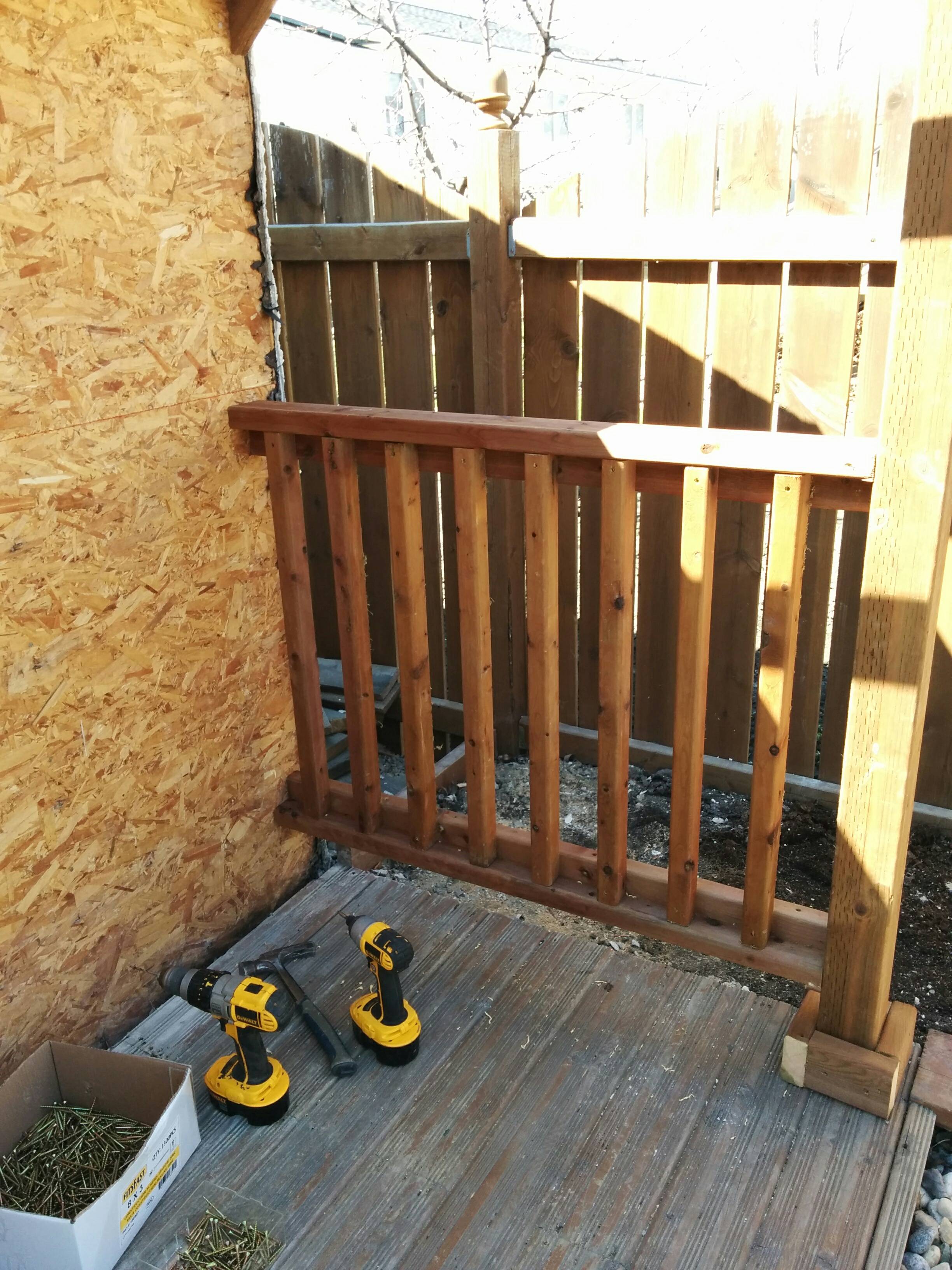 Во время работы с перголой у хозяина дома под рукой были только циркулярная и ручная пилы, молоток и гвоздодер. Из оставшихся досок сделали прочные перила.