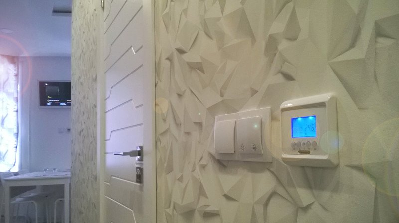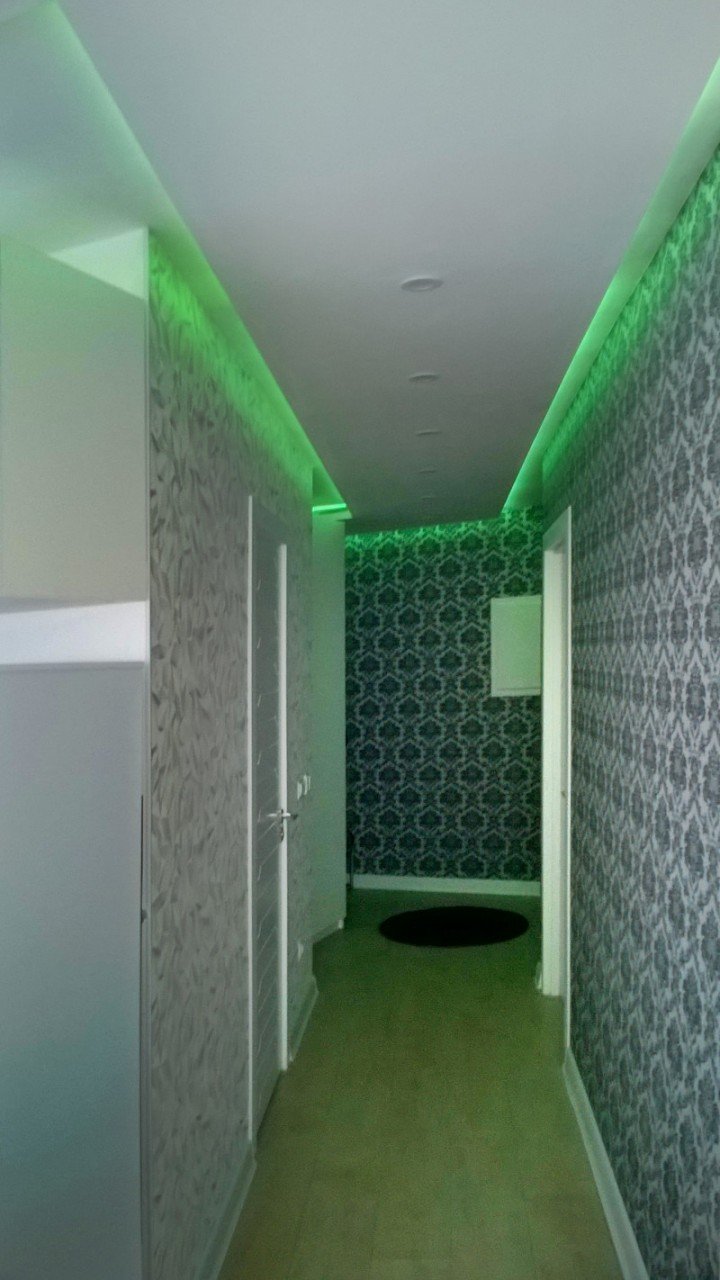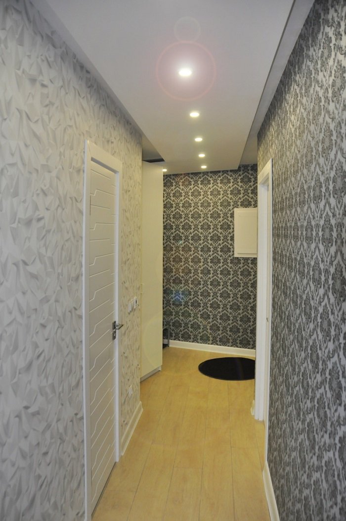 А вот фотографии после ремонта. Обои выглядят рельефными, в потолок установили подсветку, заменили дверь — и коридор преобразовался до неузнаваемости!