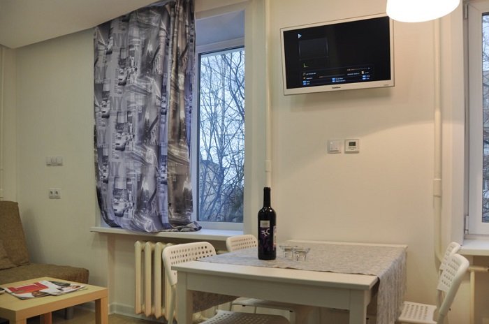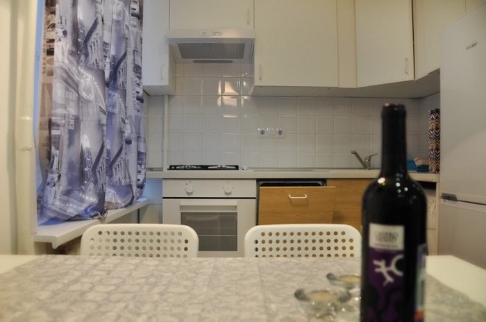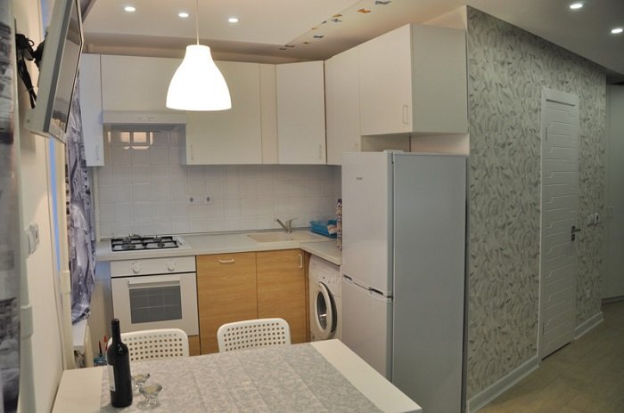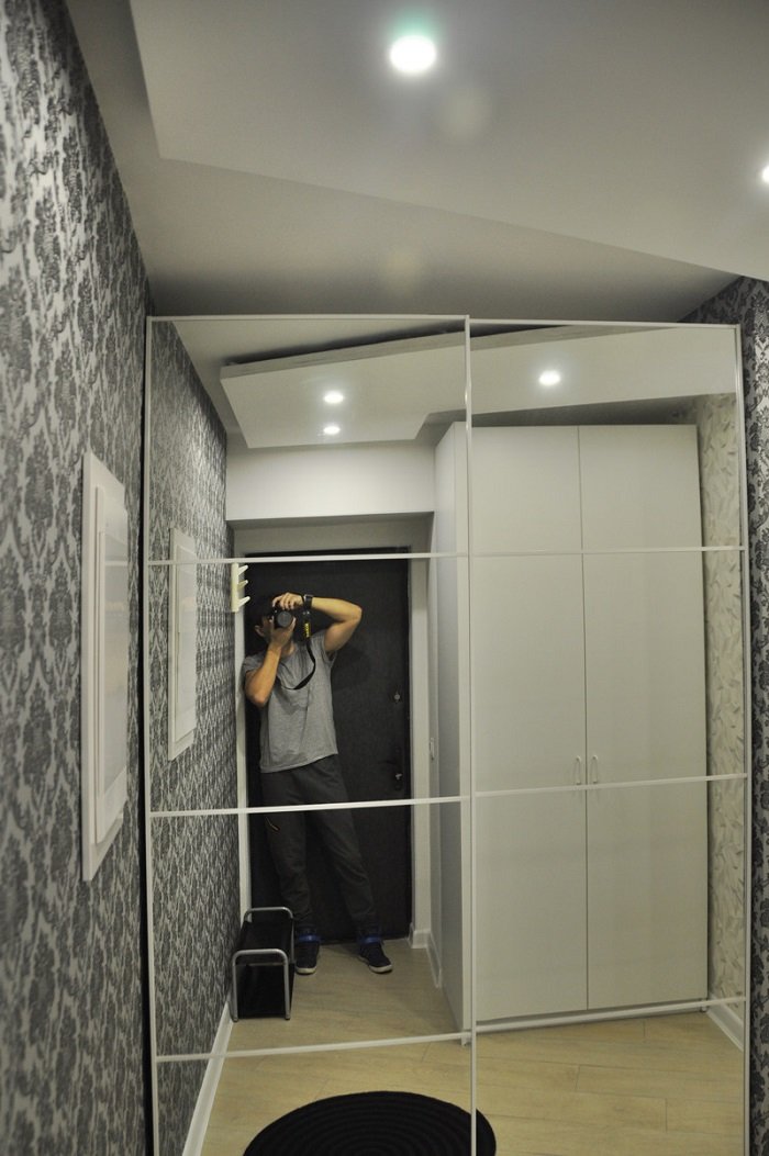 Зеркала на всю стену визуально расширяют пространство, что крайне необходимо в помещениях с маленькой площадью. Для кухни закупили новый гарнитур и во всём остальном отдали предпочтение белому цвету.