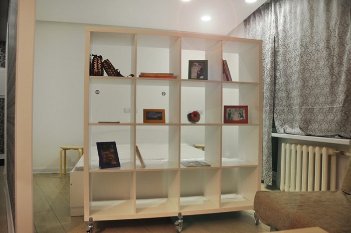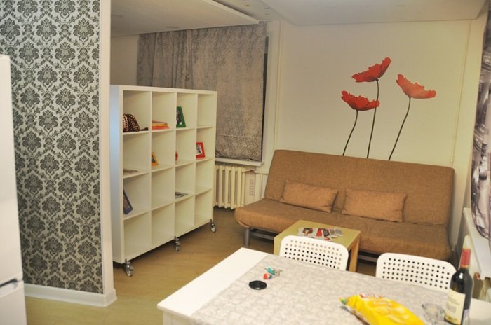 В гостиной нашел себе место компактный и удобный стеллаж с 16 полками, уютный диван и журнальный столик. Стены украсили красивым трафаретом цветов.