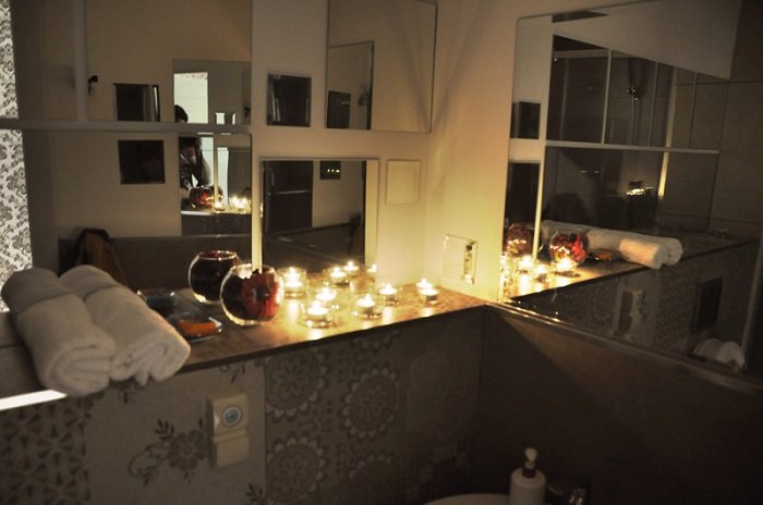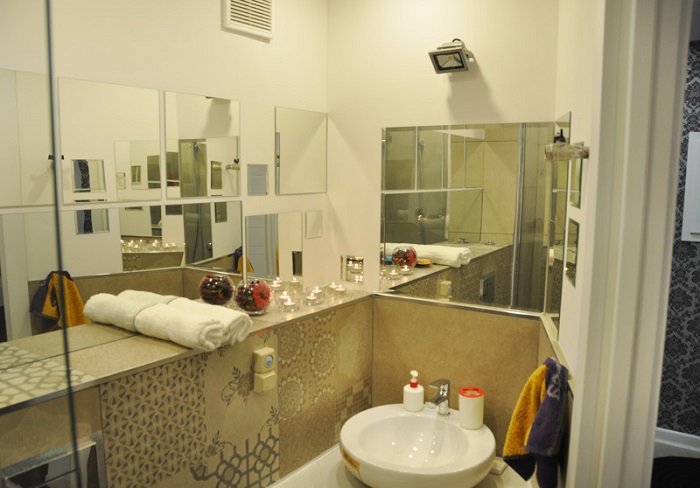 Стоит поставить пару свечек в ванной комнате, и зеркала заиграют романтическим огнем. Отражения создают впечатление, будто комната тянется на километры. Жители дома обновили сантехнику: поставили новый душ и раковину.