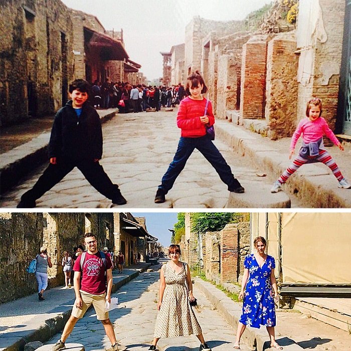 «Вместе с сестрами воссоздали фотографию в том же месте в Помпеях. Прошло 15 лет!»
