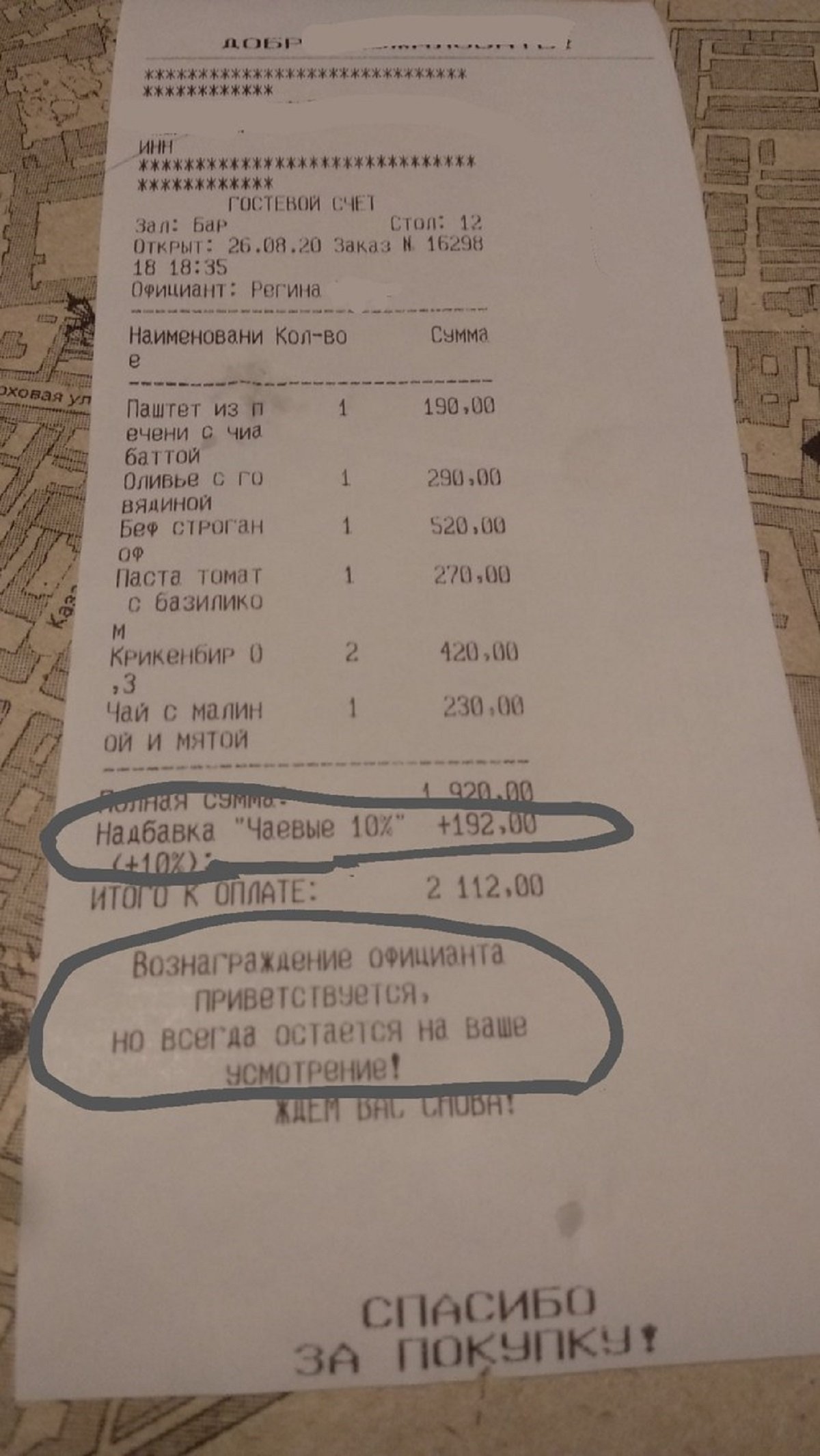 «Вознаграждение официанта приветствуется, но всегда остается на ваше усмотрение!» Ага, и чаевые включены в счет!