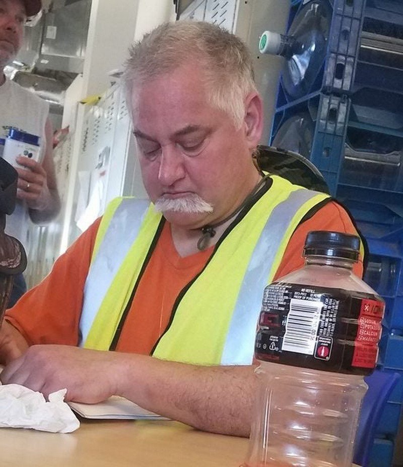 Усы постепенно сползают на подбородок, но мужчина слишком увлечен работой