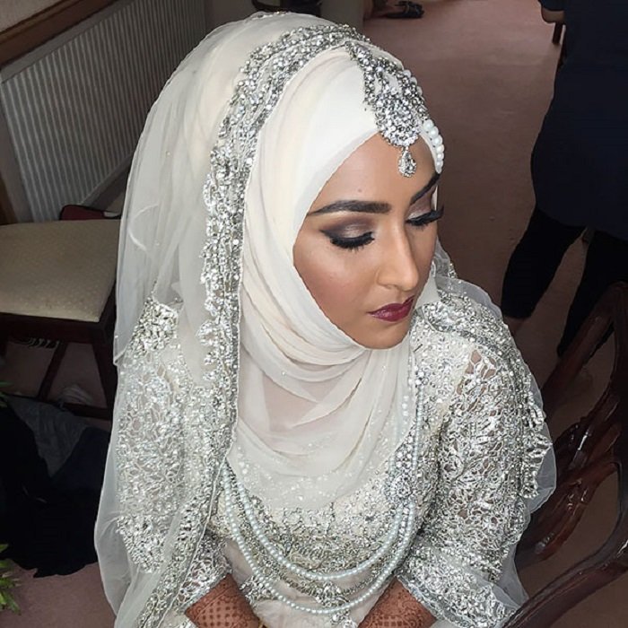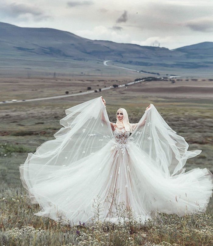 Свадебное платье должно быть максимально закрытым: плотная ткань, предплечья, шея и даже уши прячутся. Открытыми можно оставить только кисти рук и лицо.
