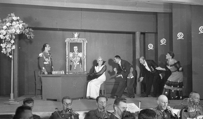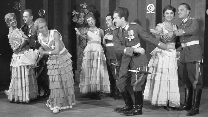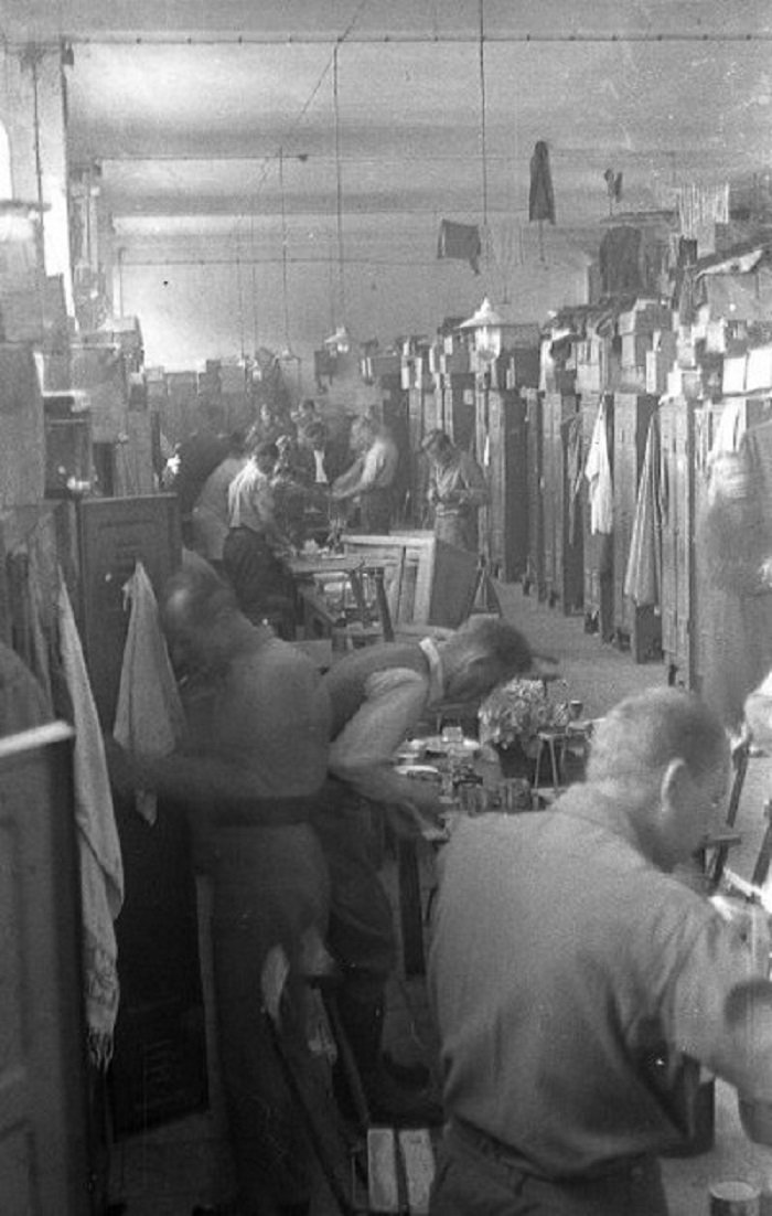 На одном из снимков заключенные наряжены в военную форму с орденами и медалями. Часть из них переодета в женскую одежду. Дам в лагерь не пускали, поэтому пленники развлекались как могли. На самом деле это театральная постановка.